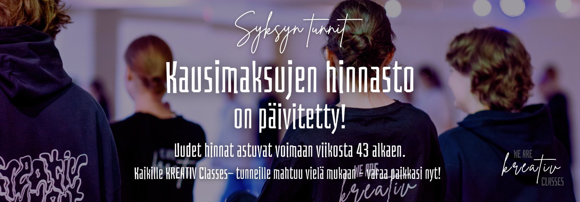 Kausimaksujen hinnastoa porrastetaan niiden tuntien osalta, joilla on tilaa. Porrastettu hinnasto astuu voimaan viikolla 43 ja on päivitetty vastaamaan syyskauden jäljellä olevia viikkoja. Liity mukaan KREATIV:in syyskaudelle täyttämällä KREATIV Classes- tuntien ilmoittautumislomake. Päivitetyn hinnaston ja muut tarvittavat tiedot löydät täältä.