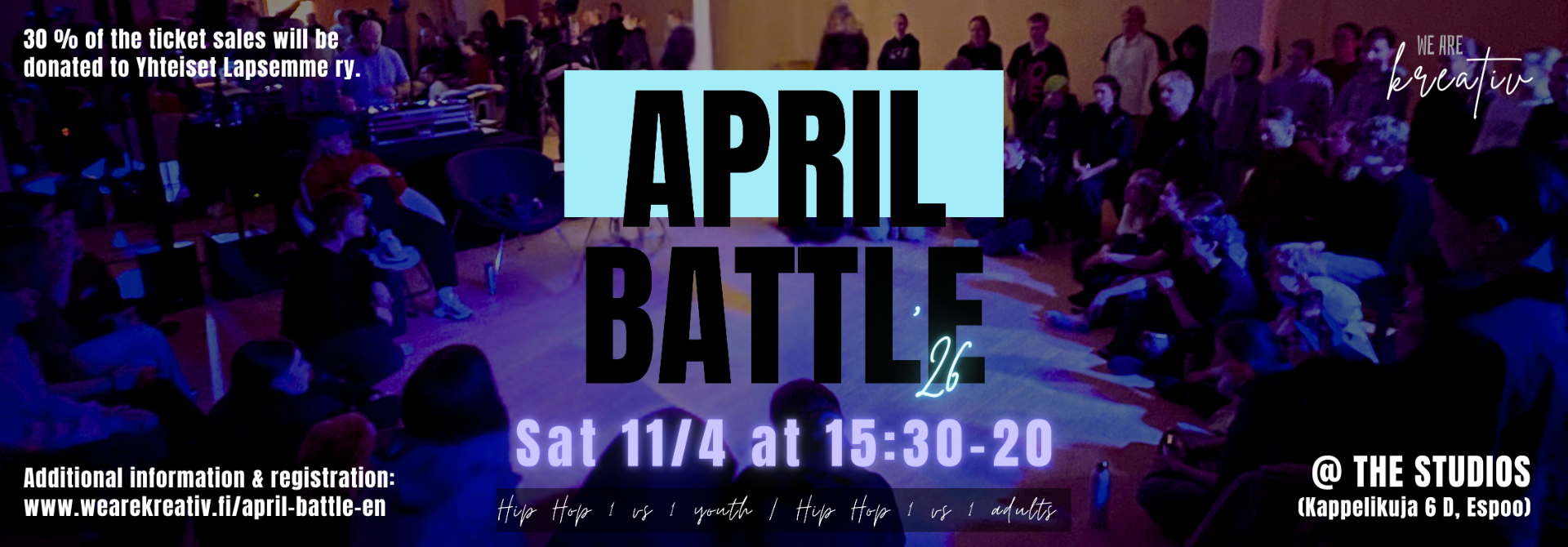 By attending the April Battles you will also be joining us in doing some good, because 30 % of the ticket sales will be donated to Yhteiset Lapsemme ry, a non-profit organization that promotes the well-being of multicultural children and the fulfillment of childen's rights.